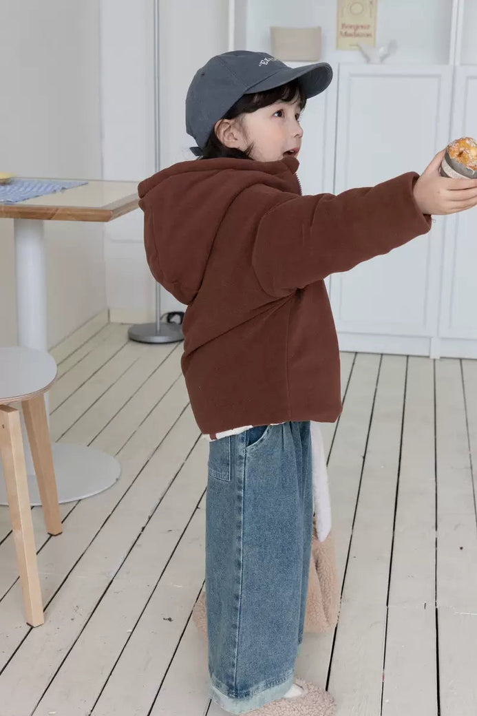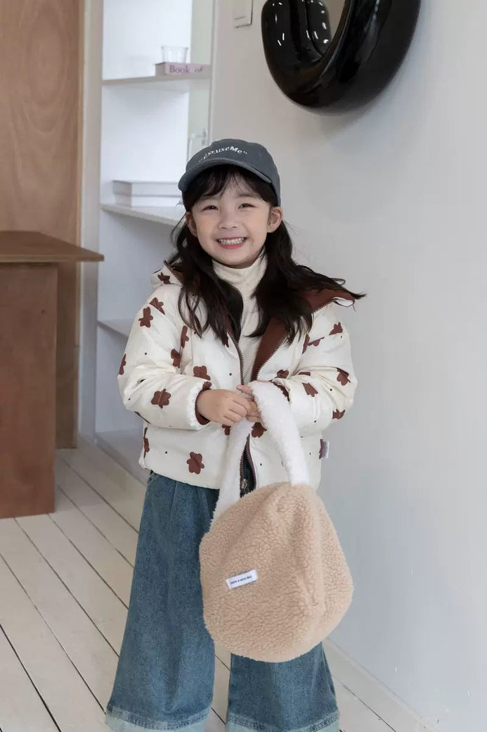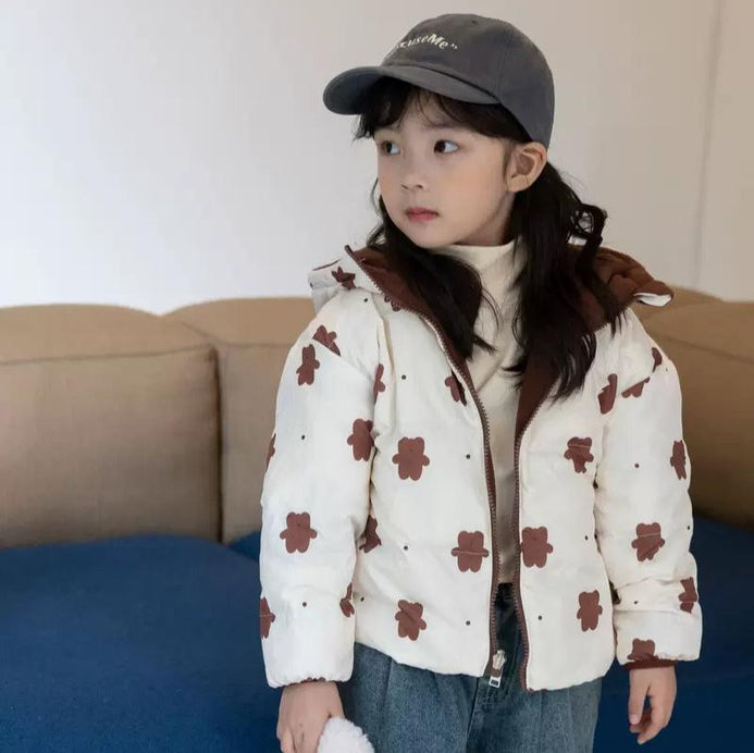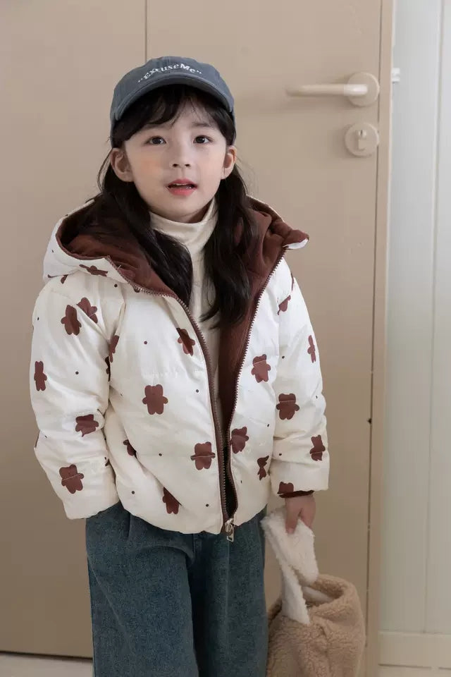Dual Side Wearable Fleece lined Brown Spots off White Hooded Puffer Jacket 13157