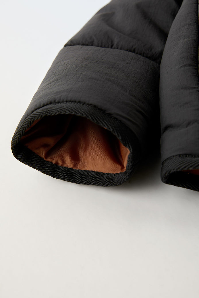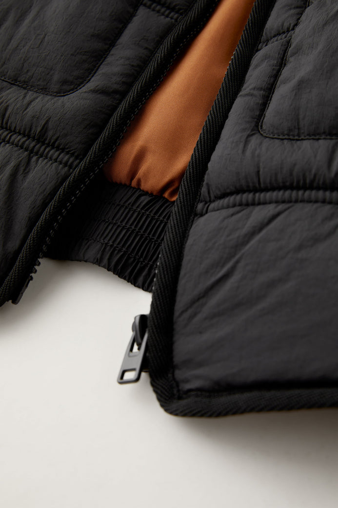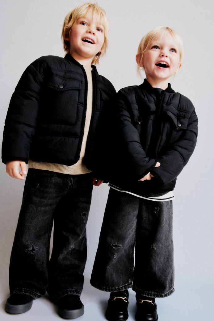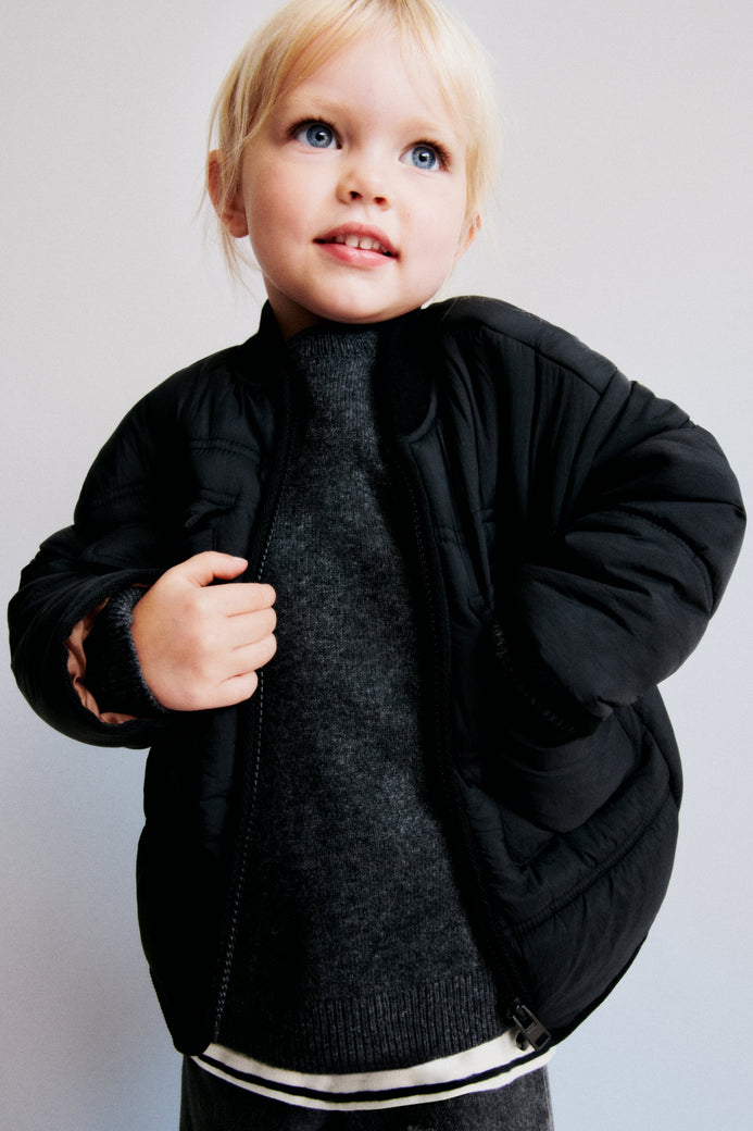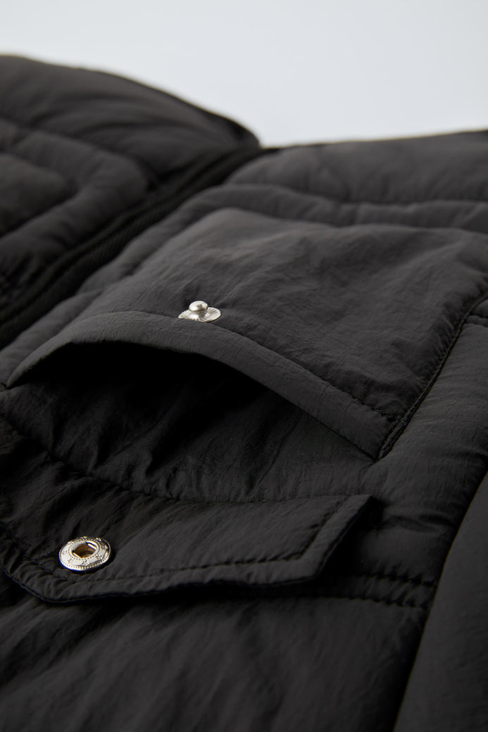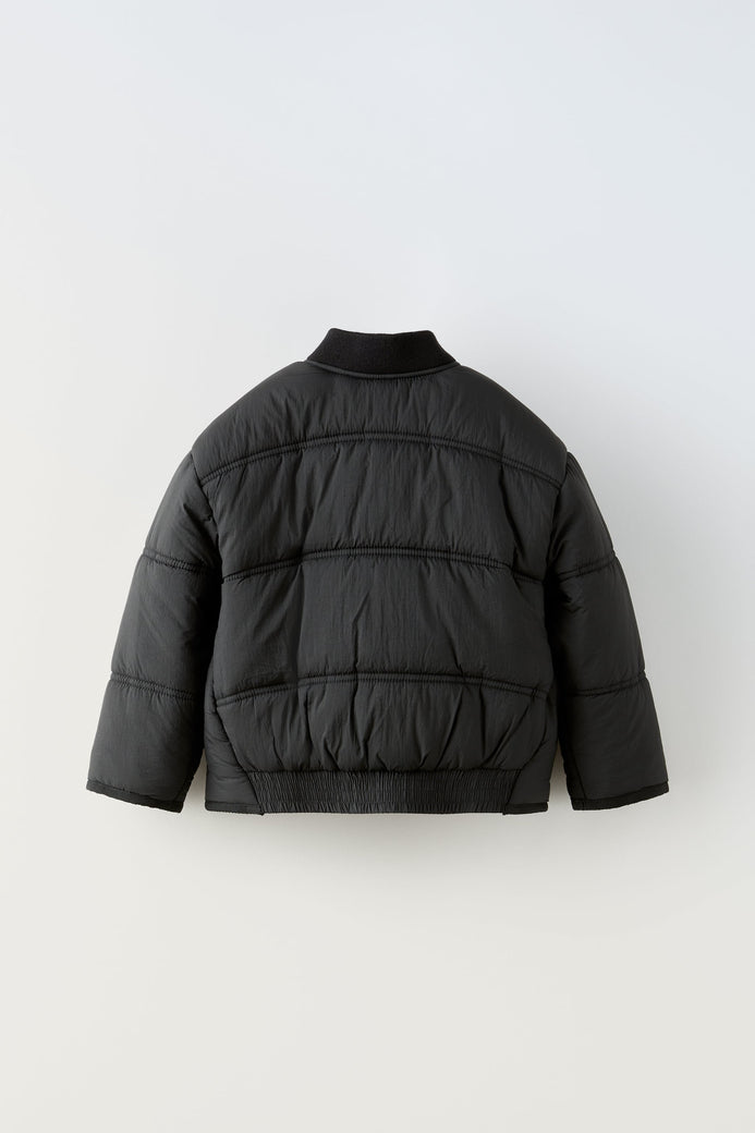 Puffer bomber jacket with a round collar and long sleeves. Zip-up front. Chest patch pockets with flaps. Special water-repellent fabric.