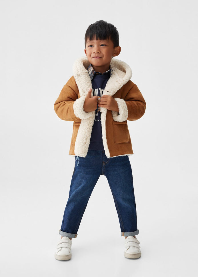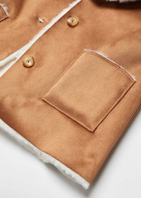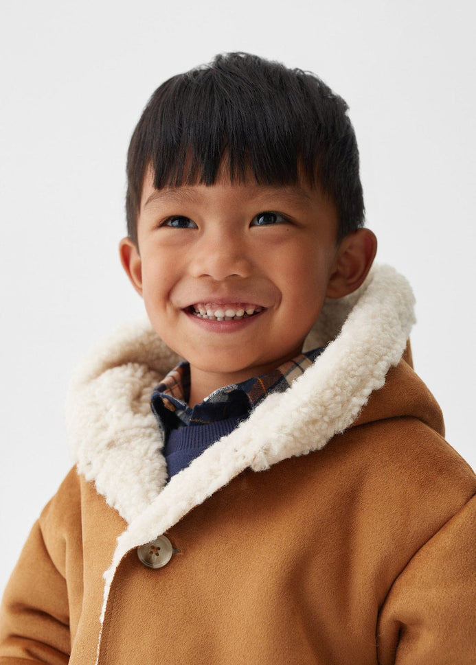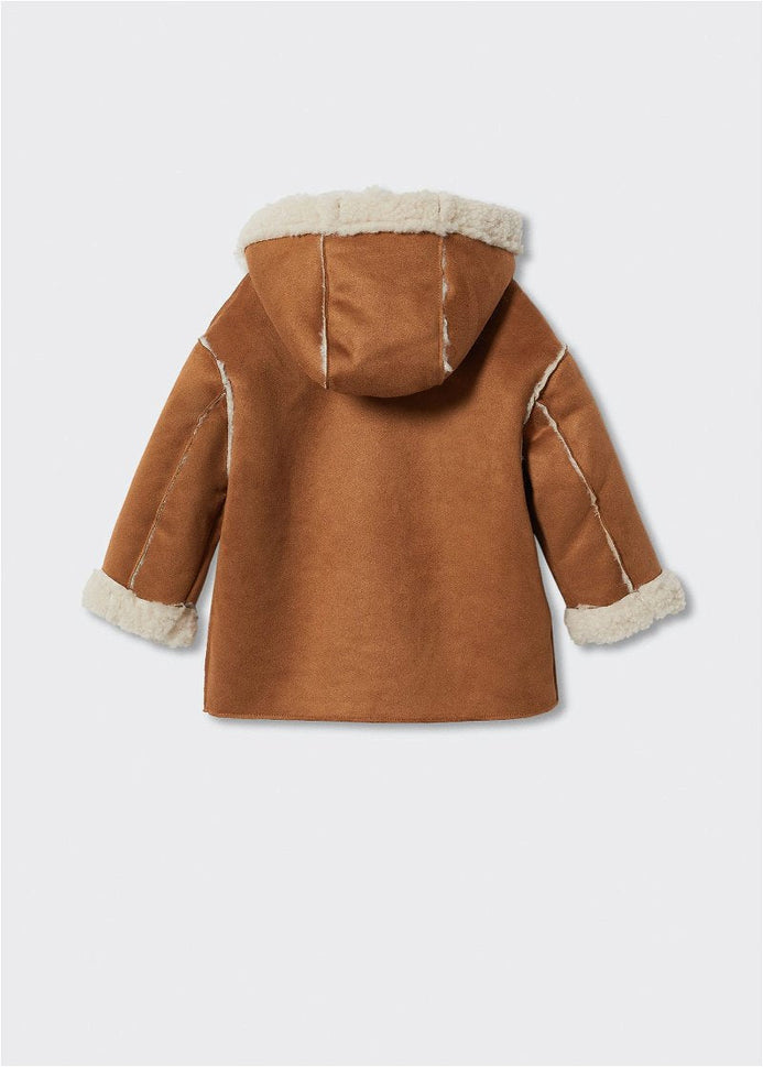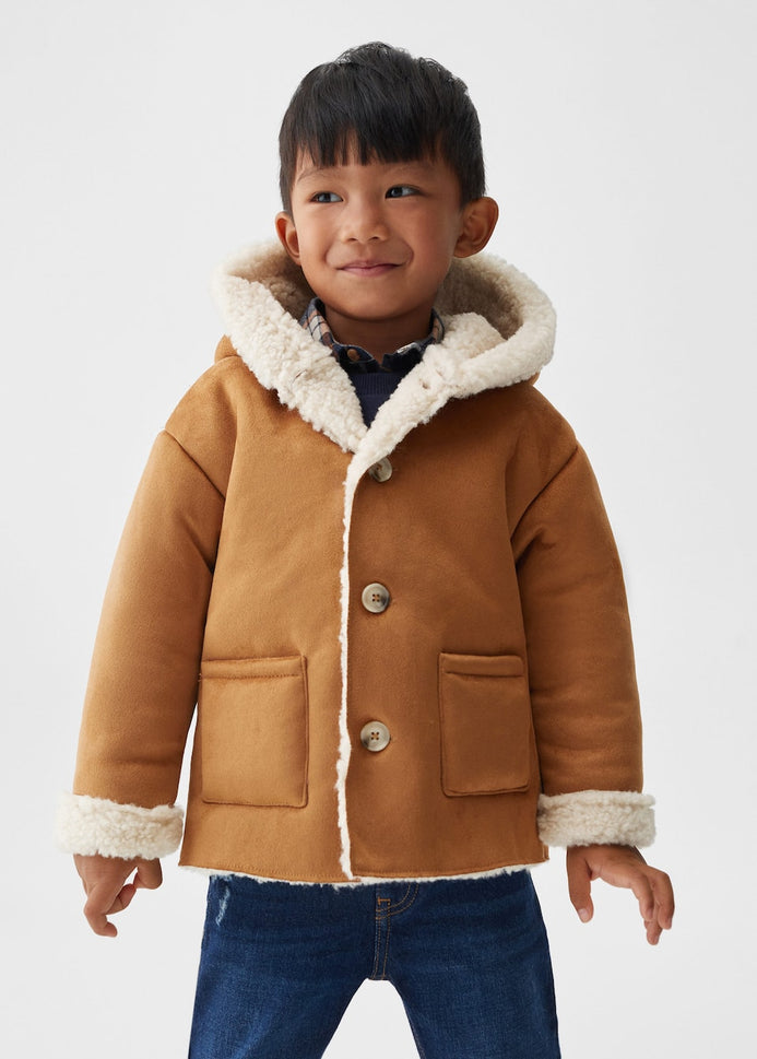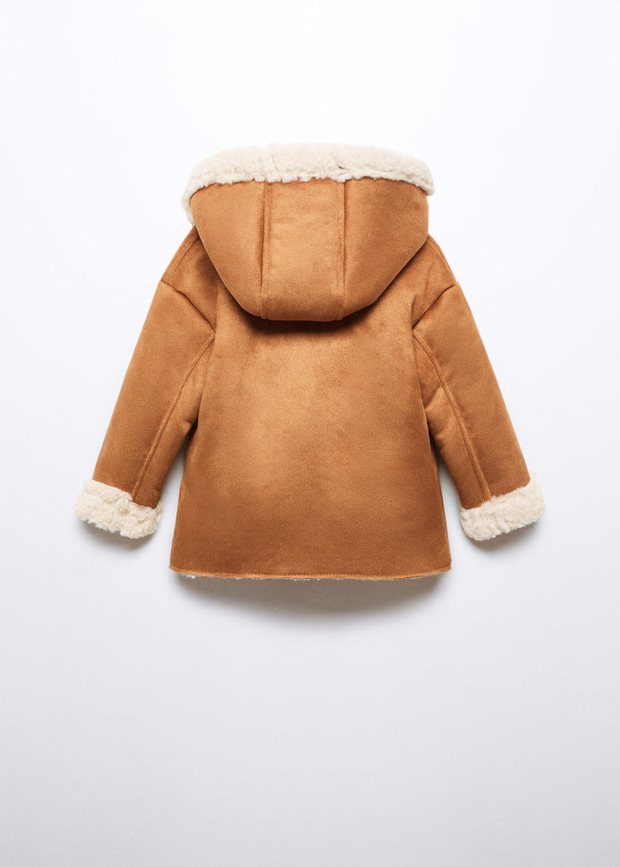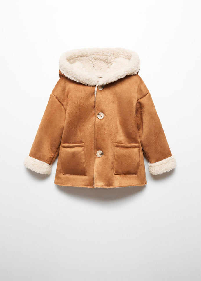 Suedette fabric. Straight design. Medium design. Rounded neck. Hood. Long sleeve. Two side patch pockets. Faux shearling interior. Button fastening on the front section. Internal label for personal data.