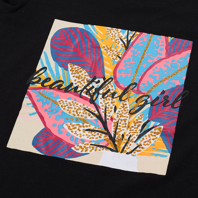 Beautiful Girl Leaf Painting Black Shirt 7333